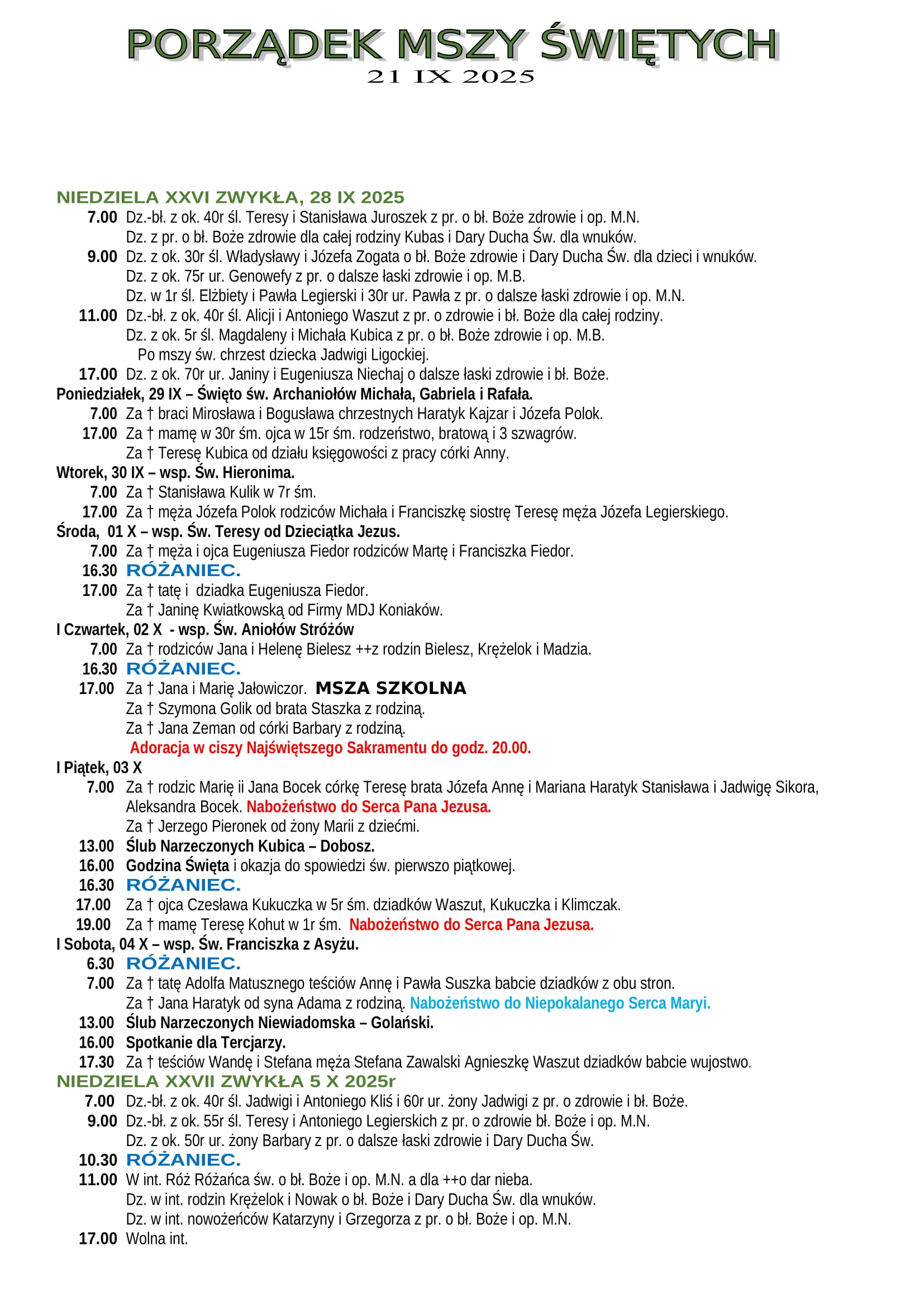 Intencje Mszalne 28.09.2025