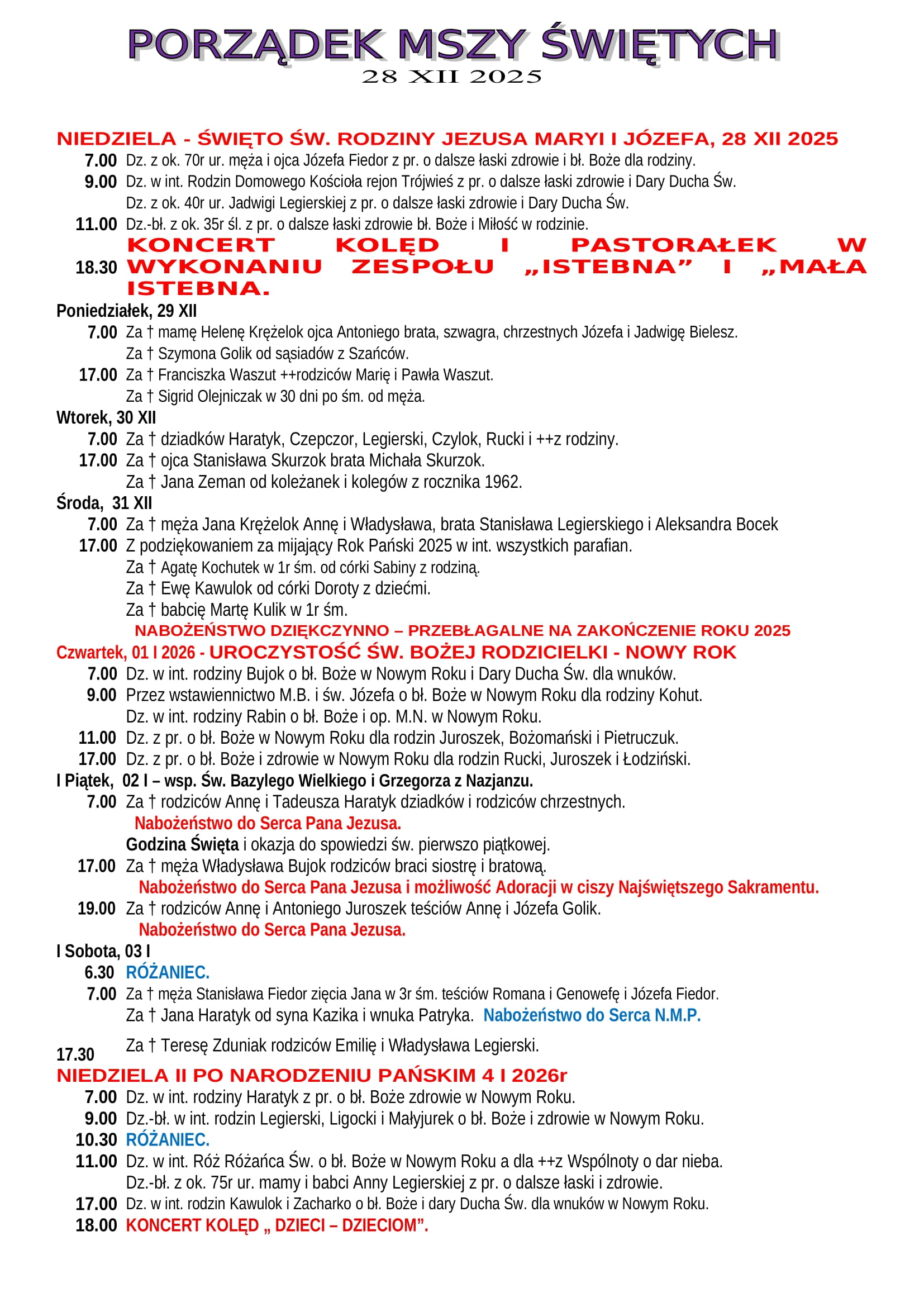 Intencje Mszalne 28.12.2025