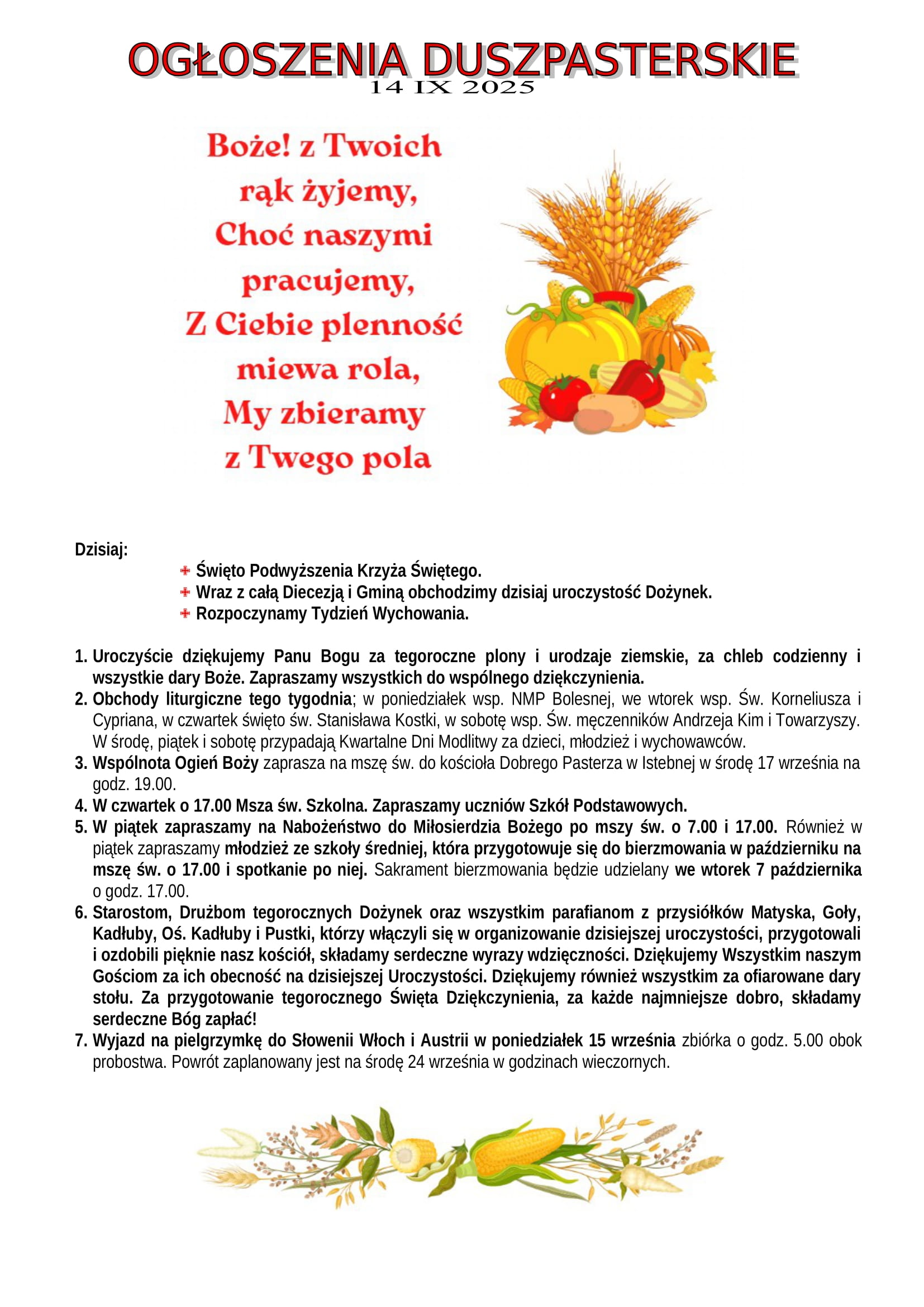Ogłoszenia Duszpasterskie 14.09.2025