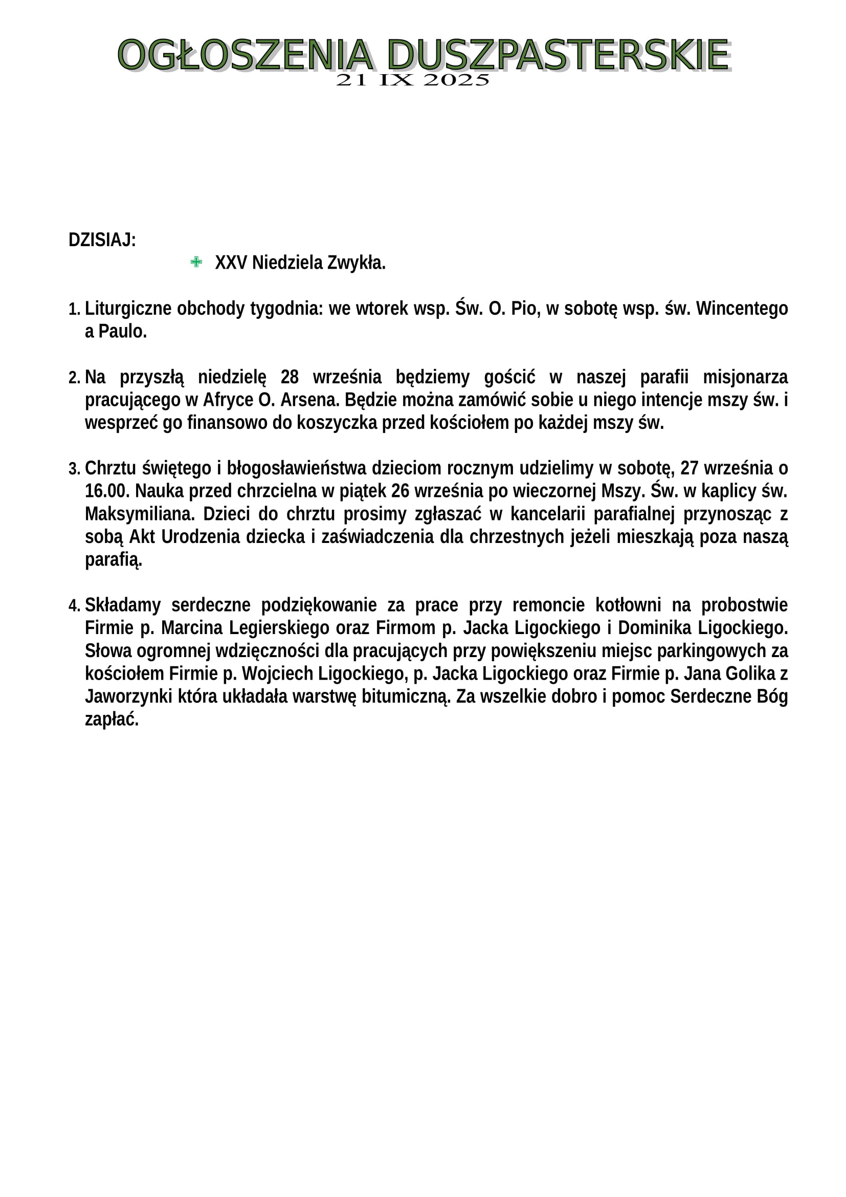 Ogłoszenia Duszpasterskie 21.09.2025